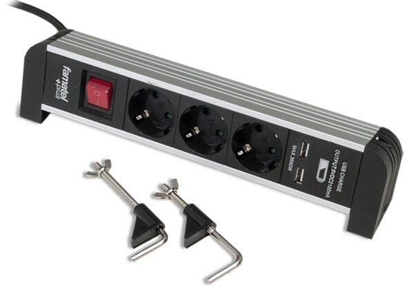 Base multiple FAMATEL de 3,4 y 6 tomas T/T mas 2 tomas USB fabricadas en aluminio para disipar el calor y con protección de sobretensión. 8429760244967